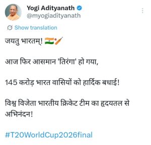 उत्तर प्रदेश के मुख्यमंत्री योगी आदित्यनाथ ने भी दी टीम इंडिया को जीत पर हार्दिक बधाई और शुभकामनाएं