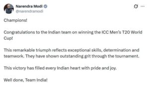 _पीएम मोदी ने एक्स पर पोस्ट कर लिखा, ‘चैंपियन. आईसीसी पुरुष टी20 विश्व कप जीतने पर भारतीय टीम को हार्दिक बधाई. यह शानदार जीत असाधारण कौशल, दृढ़ संकल्प और टीम वर्क का प्रतीक है. इस जीत ने हर भारतीय के दिल को गर्व और खुशी से भर दिया है. शाबाश, टीम इंडिया.’_